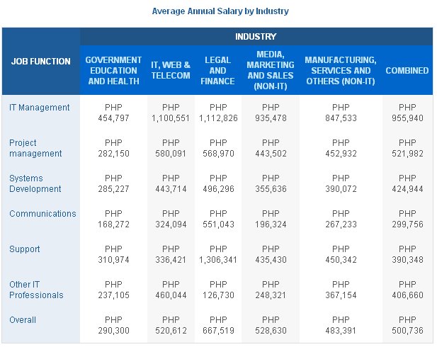 according to ZDNet Asia, we – IT PINOY’s – are receiving above-average salaries compared to our counterparts in other professions. however most of us lack IT certifications, which our neighbors have.also mentioned is that the IT PINOY receive an average annual pay of US$12,425 (Php500,736) (this according to ZDNet Asia IT Salary Benchmark Survey 2008). wow! totoo ba ito? kewl!