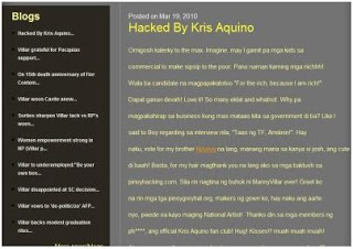 the race for the national elections further heats up as reports that sen. manny villar’s web site was been hacked with a blog entry entitled “Hacked by Kris Aquino.”