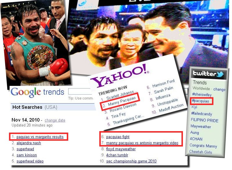 nine hours after the fight, Pacquiao is still the buzz in the web, with around 500 Facebooks pages created just for this fight. his name is still in the top trending topic in Twitter, Yahoo Buzz and Google Trends.