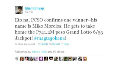 “Eto na, PCSO confirms one winner—his name is Miko Morelos. He gets to take home the P741.2M peso Grand Lotto 6/55 Jackpot! #magtagokana!” (@iamtimyap)