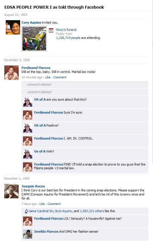 What if the Philippine People Power Edsa Revolution, which happened 25 years ago, happened today? Imagine it happening @ the time of Facebook. Here’s EDSA PEOPLE POWER I as told through Facebook, which GMA News concocted.