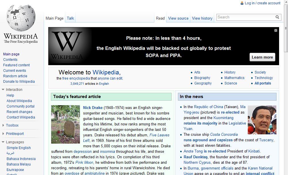 in less than 4hrs, the english wikipedia will be blacked out globally in protest of the Stop Online Piracy Act (SOPA).