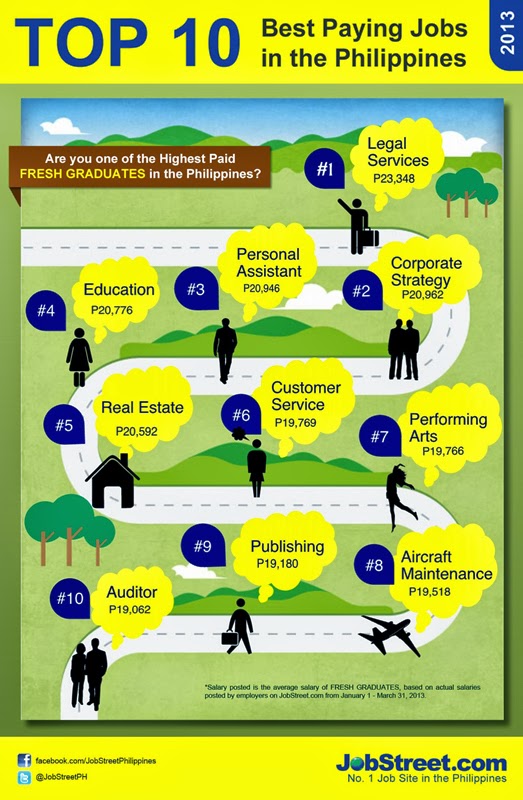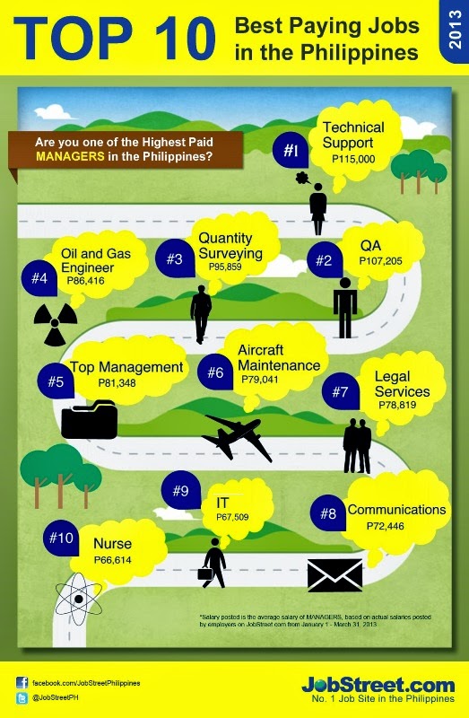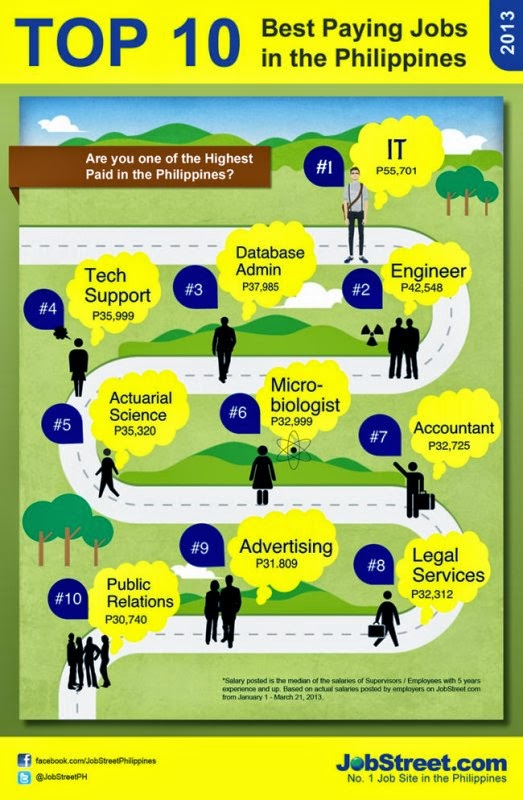 Jobstreet lists the Top 10 Highest Paying Jobs in the Philippines, which shows an averaged salary per specialization per level based on Jan 01-Mar 31, 2013 data.