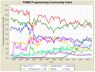 according to the long term trends below, Java has seen a steady decline in the past decade. C remained almost constant, but Objective C has increased popularity in the past five years (probably mainly because of Apple’s iOS).