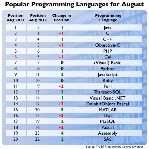 Java, C and C++ came out as the top three most popular programming languages as of august 2013, according to the latest TIOBE Programming Community Index.