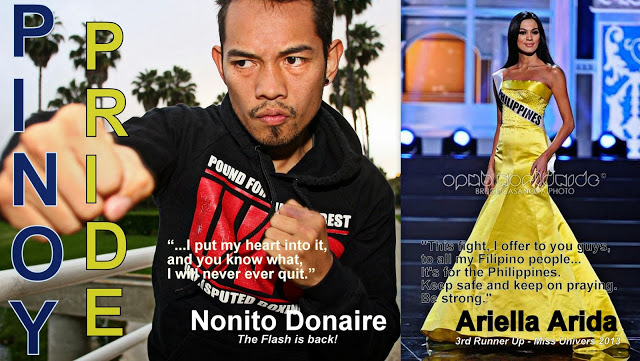 a day after super-typhoon Yolanda (international name – Haiyan) devasted Philippines, two PINOYs stood up and strive to spark hope for the rest of us. Ariella Arida won 3rd runner up in the Miss Universe 2013 and Nonito “The Flash is back” Donaire won over Vic Darchinyan via TKO on the 9th round. we’re very proud of…