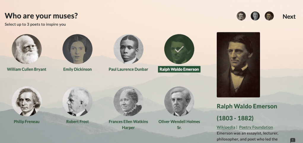 using Verse by Verse, you can compose a poem with suggestions coming from some of America’s classic poets: Dickinson, Whitman, Poe, Wheatley, Longfellow and others. in order to make this possible, they’ve trained AI systems that provide suggestions in the style of each individual poet to act as your muses while you compose a poem of your own.